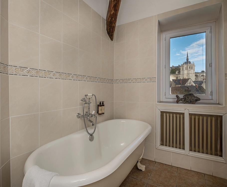 Salle de bain avec bain, douche et Wc séparés avec vue sur le château.